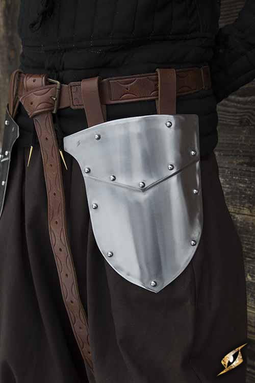 Epic Armoury’s Soldier Belt Shields are two plates designed to protect the thighs. These rolled edge steel plates hang from your own belt to cover the outer thighs, sliding into place using brown leather loops securely fastened with rivets. Each plate is 25cm long and 21cm wide, with two 24cm folded leather loops.