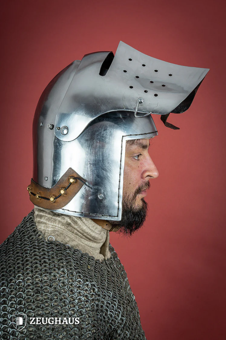 This polished Full Visor Bascinet Helmet features an adjustable visor with strategically placed punctures for enhanced breathability during prolonged wear. The clever addition of a leather strap with a buckle on the side of the visor ensures a secure fit, making it ideal for various combat scenarios. For peace of mind, the helmet is equipped with a rivet spring locking system, ensuring that it stays securely in place. Whether you're delving into historical reenactments, participating in LARP events, or simply adding to your armor collection, this helmet is the perfect choice.