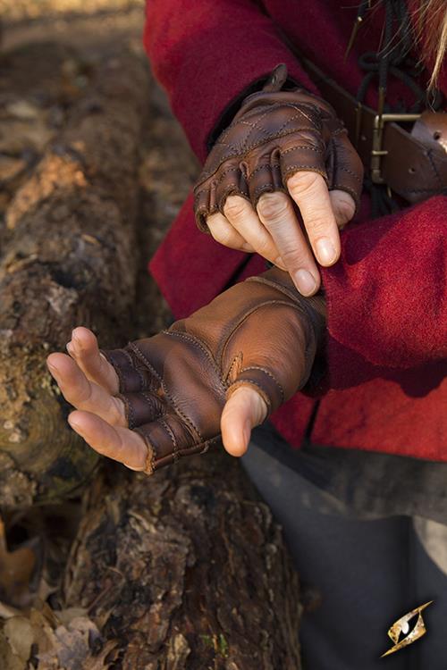 Epic Armoury’s Brown Celtic Gloves Leather are fingerless leather gloves with short cuffs. They are made from black dyed leather and stitched at all joints around the fingers, wrists and edges. This stitching improves the strength of the material by preventing it from deforming with heavy use or from exposure to the environment. The fit of the gloves can be adjusted with a leather strap around the wrist.