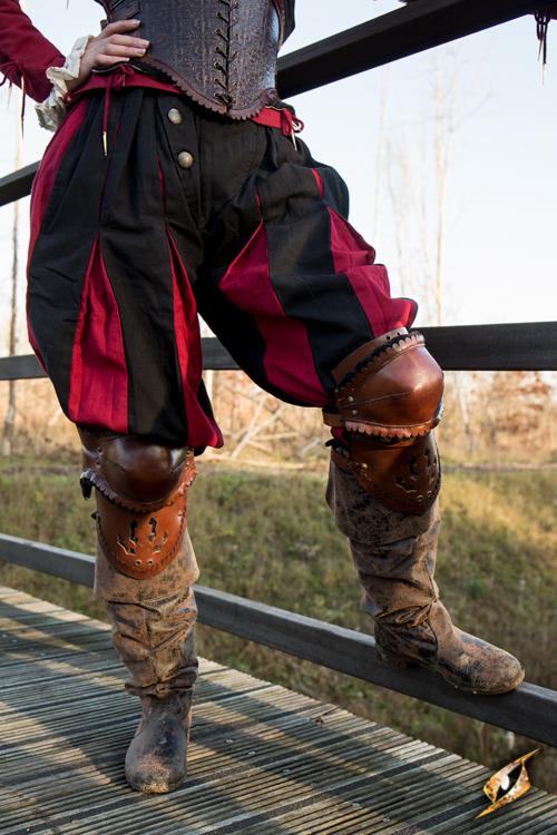 Made of hard top-grain leather, these armour pieces are built to withstand the abuse of a LARP or reenactment with regular leather care. Two leather straps are used to keep each of the Noble Poleyns in place. Brass eyelets along the shins and at the top of the poleyns can be used to attach to thigh and shin guards. Worn on their own or with an entire set of armour, these Noble Poleyns are sure to add some class to your costume.
