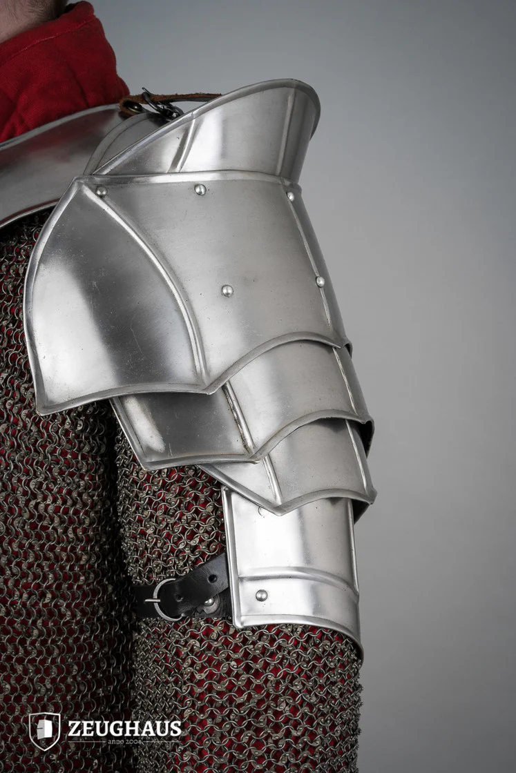 Plate shoulders with simple fluting for increased stability and blade breakers on the shoulder segment. The upper arm thrusts also consists of three parts. The shoulders are not that big, but more flexible.
