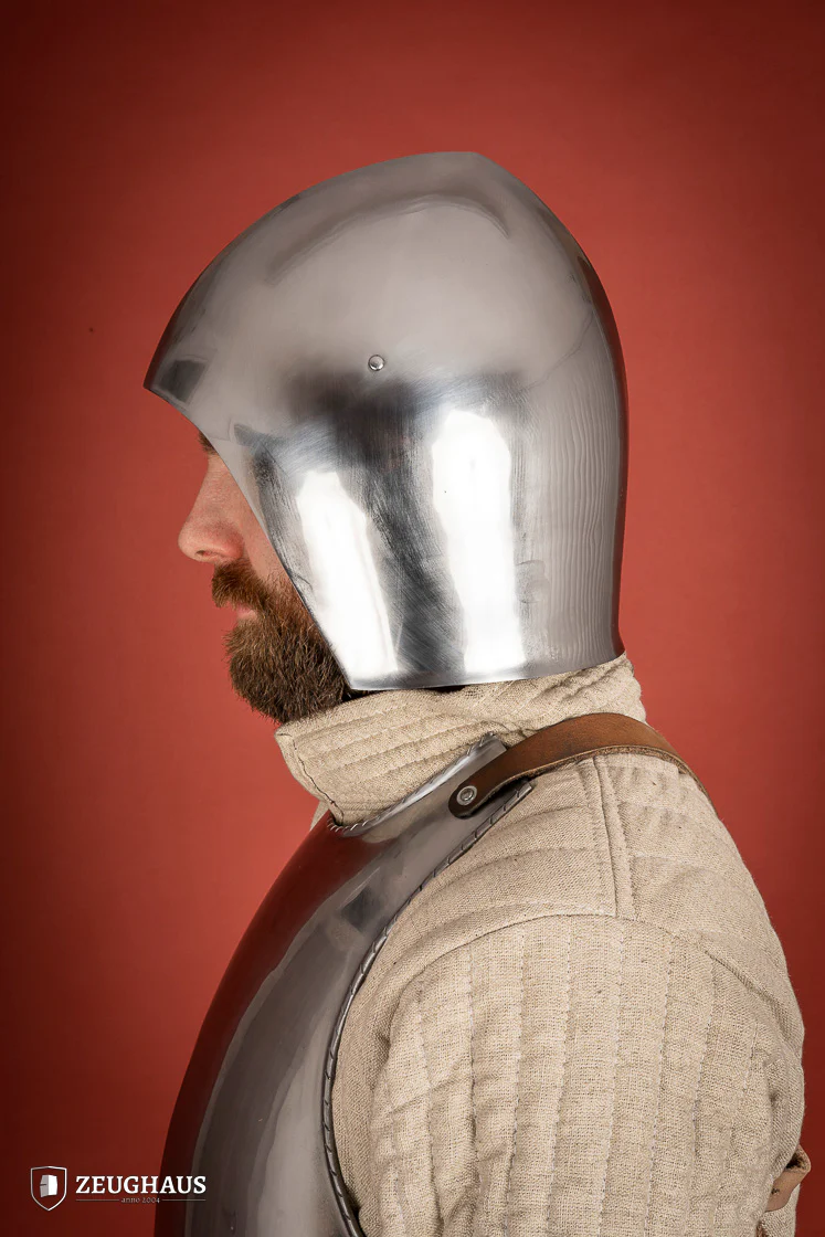 Its pointed shape is specifically designed to avoid any damage to the neck by hits. Some of these helmets were combined with a coif instead of with an aventail.